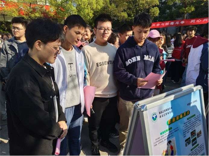 23日下午九医杏林青年志愿者在员工科科长陈文雯的带领下参加了学校禁毒展览活动。 在三食堂广场上濂溪区公安局携手保卫处开展了禁毒展览,同学们通过观看毒品样本和展板,进一步了解了毒品的种类、危害以及如何识别和防范毒品。