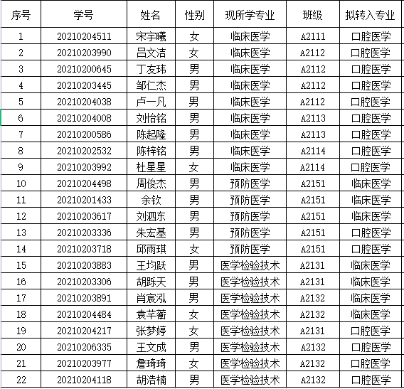 医学院2021年经过转出考试和资格审查,以下同学具有转专业转出资格,公示如下: