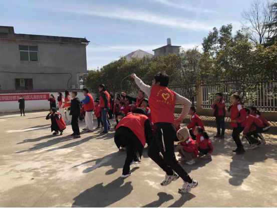 在校园里,志愿者陪孩子们做游戏,每个人脸上都洋溢着欢乐。