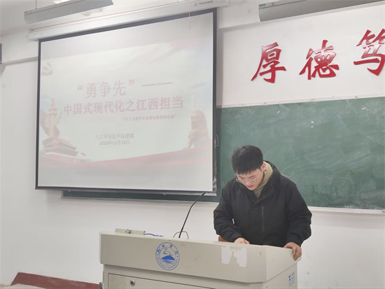 修天宇、申妍、谢志远、刘旭辉、黄宇昕、陈琦琪等宣讲员结合实际学习生活经历,为同学们从中国式现代化之江西担当、构建江西现代化产业体系、以九江为例从长江文化中读懂中国式现代化、共建绿色江西生态文明高地四个方面传达学习习近平总书记考察江西的重要讲话精神习近平总书记重要讲话鼓励广大青年必须挺膺担当,以更加自信自强的精神姿态保护好、传承好长江文化,用年轻的声音讲好长江故事,擦亮中华文化名片,助力长江之舟劈波斩浪,推动中国式现代化行稳致远。