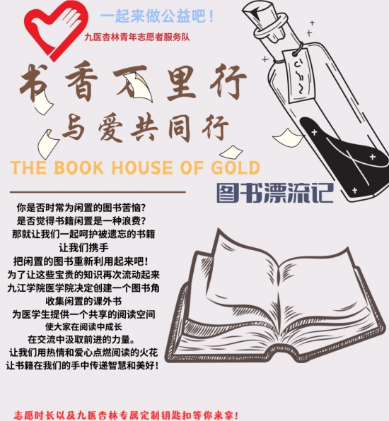 为了进一步加强同学之间的读书交流,呵护被遗忘的课外书籍,积极打造医学院书香图书角,促进员工之间的交流和互相帮助,进一步宣传公益理念,医学院于11月11日在26栋125开展了“书香万里行,与爱共同行“捐书活动。