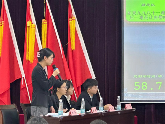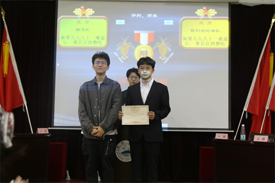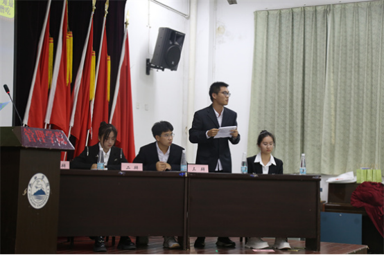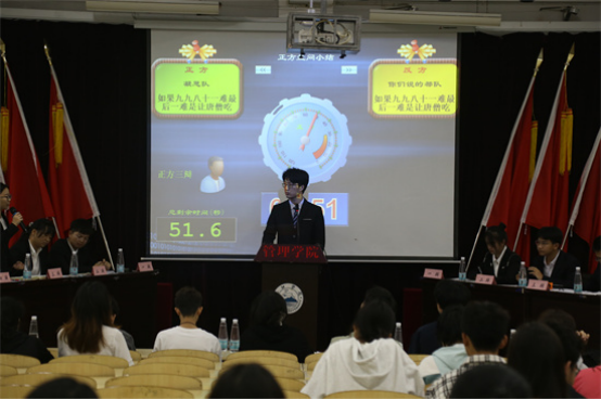在比赛开始前,主持人进行了试音、宣读比赛评分标准以及介绍正反方代表队等环节。比赛正式开始,首先由正方A2314班开篇立论,提出“如果九九八十一难最后一难是让唐僧吃肉,唐僧该吃”,并由反方A2312班进行质询,双方以交替形式轮流发言,现场气氛迅速升温。在随后攻辩的环节中,双方更是步步紧逼,从概念定义、判断标准、利弊对比等角度分析辩题,将比赛推往白热化阶段。辩手们精辟的措辞、犀利的论证、巧妙的思路给观众留下了深刻的印象,赢得阵阵掌声。辩论结束后,评委们针对辩题的论证逻辑、辩手的现场表现等方面进行了点评,并向辩手们提出了相关的指导意见,鼓励辩手们积极参加相关活动。经过评委公平公正公开的评判,A2312班获得本次辩论赛的冠军,A2314班获得亚军,A2331班获得季军,A2312班的杨佳伟荣获“全场最佳辩手”称号。