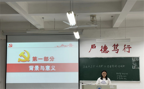 在义丰楼407,A2251班团支书向同学们讲述了习近平总书记在江西的行路历程,及此次考察后的讲话精神与对江西的期望,希望同学们深入学习贯彻习近平总书记关于推动长江经济带高质量发展的重要讲话精神,在服务和融入重大国家战略上展现江西作为。