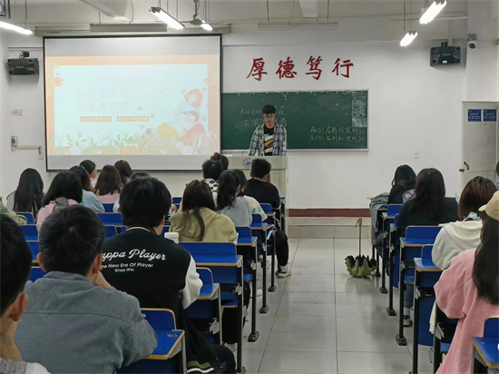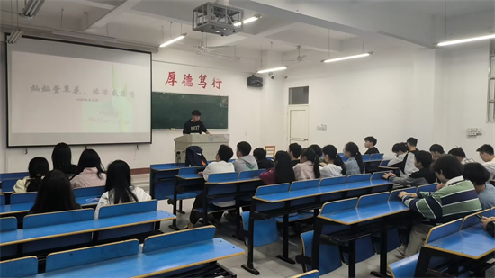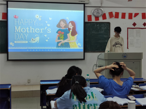 在义丰楼407,A2251班团支书通过PPT向同学们介绍母亲节的由来、各国母亲节习俗和关于母亲节的赞歌,通过对母亲节的相关讲解唤醒同学们对母亲的记忆。同时,团支书还强调了感恩父母是中华民族的传统美德,告诉同学们要以实际行动去报答父母。在本次团日活动的最后,团支书还向同学们拓展讲解了“共青团创立发展中的重大事件”。