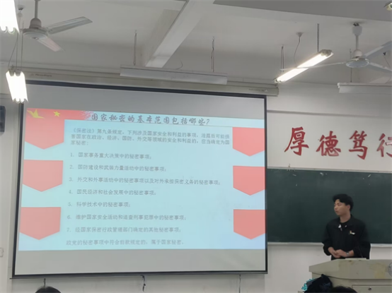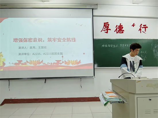 在义丰楼407,A2252班团支书首先强调了增强保密意识的重要性,随后通过知识小竞赛的方式与同学们积极互动,让每一位同学都参与到活动中来,在其中深刻体会安全防线的意义。最后团支书寄语同学们要以爱国之心,以保国之愿,以奋斗之躯,以强国之志安于此地,维护社会和谐稳定。