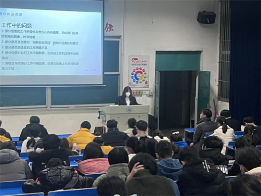 会议开始,各员工部门负责人就2022年工作进行述职。首先主席团代表、团委副书记、校园文明志愿中心负责人依次做出工作总结汇报。而后依次由组织部、办公室、文体部、学习部、志愿者部、创新创业部、权益部、资助部、新媒体部、自律服务中心、劳动服务中心、生活服务中心顺序,各部门负责人分别对本部门工作做了详细介绍的同时,并对本学期工作中的不足进行检讨与改进。大会现场井然有序,员工干部们不仅深入了解了每个部门的工作内容,极大地促进了各部门相互了解、相互配合;同时,在学习中进一步提升自我工作方法和能力,查找自身不足,为后续工作的开展奠定良好基础。
