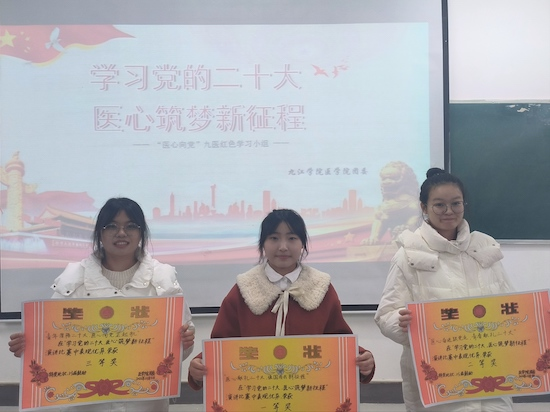 比赛准备阶段,大家积极踊跃报名,并自发组织小组练习,挑选出符合主题的演讲内容,并探索新颖的表演方式。比赛开始,各组同学精神饱满、声情并茂,演讲不拘一格、形式新颖,极富有艺术感染力和吸引力,体现了当代青年老员工的创新能力。各组演讲紧紧围绕党的二十大,从学习二十大精神、学习二十大代表人物、歌颂新时代十年伟大变革和认真学习习近平总书记的青年寄语等多个方面进行演讲。比赛现场精彩纷呈,最后经由评委打分评比出获奖小组 。“聚焦二十大代表,奋进新时代征程”、“医心献礼二十大,强国有我新征程”荣获一等奖,两组表现优异,精彩绝伦,歌颂了新时代中国的伟大变革,演讲内容振奋人心,紧扣党的二十大主题。“青春弘扬杏林志,百年党史照初心”、“出发!我们的二十大”、“医心奋进跟党走,青春献礼二十大”荣获三等奖。三个小组演讲声音洪亮,自信大方,以演绎加朗诵的形式突出主题——党的二十大精神。“青春献礼二十大,笃医奋进向未来”、“落实二十大精神,奋进新征程”、“青春深悟二十大,医心向党正起航”、“非凡这十年”荣获三等奖。四组同学演讲热血沸腾,积极向上。比赛过程中秩序井然,活动顺利进行。随着最后一小组的演讲结束,比赛迎来尾声,由各位评委为获奖小组颁奖。大家不仅从活动中更加深刻的理解与学习了党的二十大精神,同时也展现出了医学院学子“医心向党”的精神风貌。