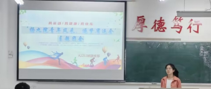 在义丰楼405教室,A2218班积极开展了本次主题团日活动。团支书首先向同学们介绍了本次省运会活动举办地、场所以及省运会的精神,随后讲述了“体育”是实现中国梦的重要内容这一事实,最后阐明我们应该重视青少年体育运动的理念。