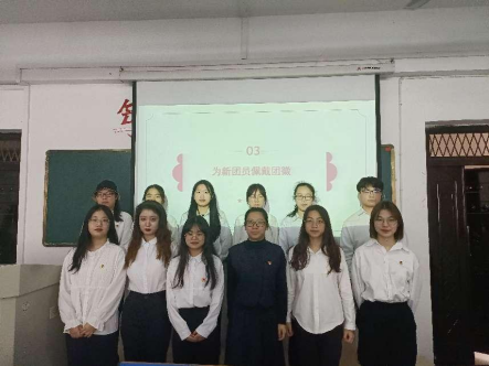 入团仪式在奏唱国歌声中拉开了序幕。紧接着,由组织部负责人岳奋芪宣读新入团团员名单,并对新团员的加入表示热烈的欢迎。之后,由樊云燕、团委委员为新团员佩戴团徽。戴上团徽的那一刻,就意味新团员多了一份责任,增添了一份义务。它将时刻提醒新团员应以身作则,以优秀团员的标准严格要求自己。