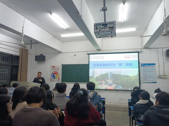 讲座伊始,胡武昌经理讲解了“向光出发,向阳而行”心理健康内容,胡经理向同学们介绍了心病所出现的原因,并解释了高校心理疾病多发的原因,分析了七情六欲的概念,使同学们更好地理解情绪。胡经理还讲授了关于心理问题和心理障碍的区别,借用马斯洛需要层次理论讲述了一些可以帮助同学们走出心理不适的问题,通过认真思考这些问题以达到明确自身走出阴影的目的。