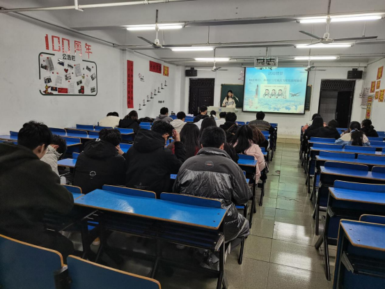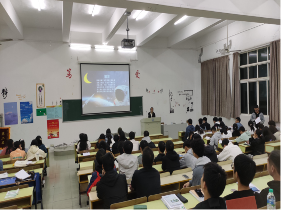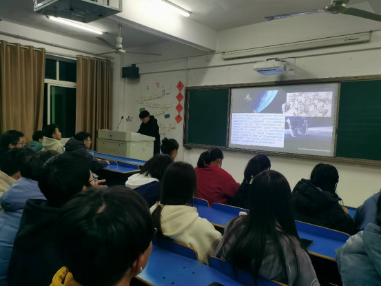 在思贤楼608,A1901班团支书先讲解了神舟十三号载人飞船的发展历史、主要任务和对我国航天力量发展的意义,随后介绍了神舟十三号航天人过去所付出的努力。他告诉同学们要多关注中国航天事业的发展,学习航天人“特别能吃苦”的精神,以兴邦为己任,不负时代韶华。