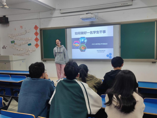 11月16日晚,在华文楼201新媒体部负责人夏侯雅玲向部门志愿者们介绍了本次培训会内容,她强调大家作为一名合格的员工干事,不仅学习上要做到优异,更应该在生活和日常工作中要做到:“腿勤,嘴勤,手勤,脑勤”即所谓的“四勤”素质。