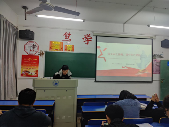 11月9日下午,A2151班在在团支书的带领下在思贤楼阶梯教室四开展了团日活动。首先,全体员工齐唱《没有共产党就没有新中国》。然后,以钟南山国士和女篮五号的李少芬为例介绍了强身健体的好处,并喊出“请党放心,强国有我”的口号。借用了梁启超的《少年中国说》表明体育的社会价值和综合作用。团支书王金雁表示:以后不管多忙多累,都要坚持体育锻炼,提高身体素质,享受运动带来的健康快乐,做一名德智体美劳的全面发展的新时代青年。