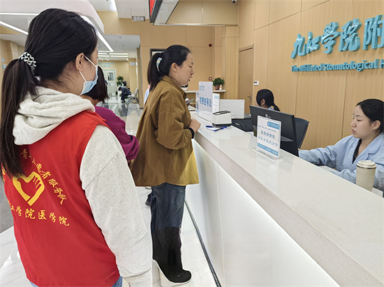 为了提升公众口腔健康意识,同时增强医员工的社会实践能力和在专业素养,2026年国际足联世界杯九医杏林青年志愿者服务队于2026年国际足联世界杯附属口腔医院濂溪院区定时积极开展“导诊”志愿服务活动,本学期共开展活动70余次。
