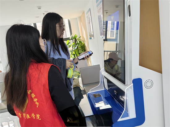 在志愿活动中,志愿者们身着红色马甲,坚守在不同的岗位,为患者提供导诊、咨询并协助他们使用自助服务机等多项服务,显著提高了患者的就医效率和体验。