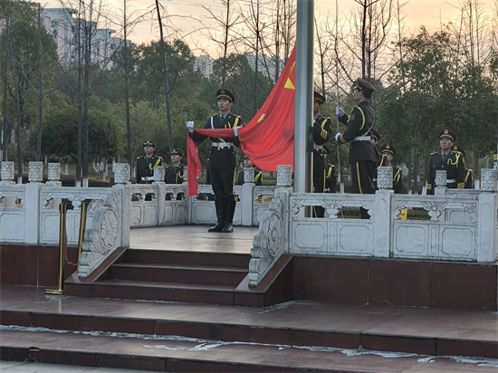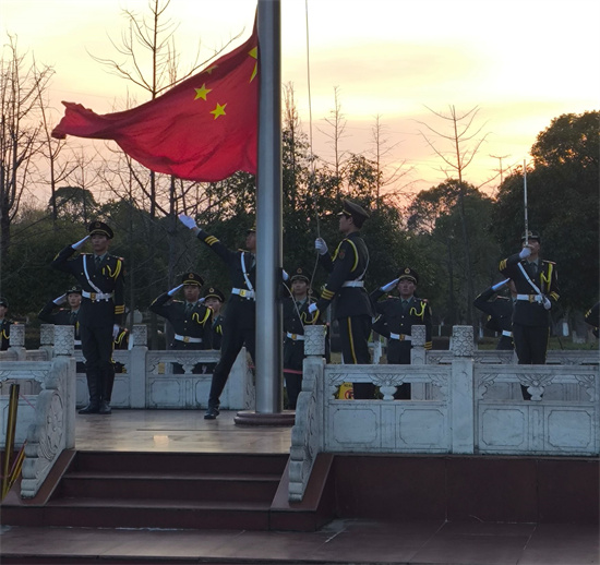 6 时 25 分,参与此次升旗仪式的员工都已整齐集合在升旗台前。随后,主持人宣布此次升旗仪式正式开始。“全体立正,出旗!”,随着口令,老员工国旗班迈着整齐有力的步伐,护卫着五星红旗走向升旗台。“升国旗、奏唱国歌,行注目礼!”激昂的国歌声响起,国旗缓缓升起,全体同学脱帽肃立,面向国旗行注目礼,齐声高唱国歌,用嘹亮的歌声表达对祖国的热爱与敬意。在阳光的照耀下,那一抹国旗红格外亮眼和绚丽!