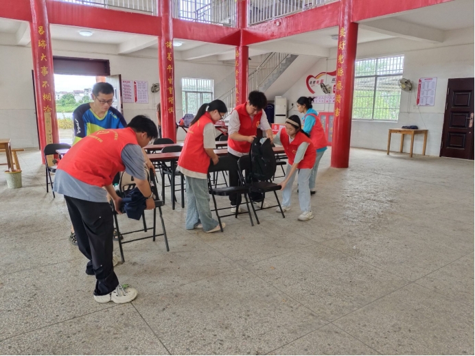 清晨,实践队首站抵达瑶前村支部委员会。村委书记对实践队的到来表示热烈欢迎:“乡村振兴需要知识赋能,医员工下沉基层开展教育实践,正是为农村孩子打开看世界的窗口。”在村委的支持下,队员们协助采购并搬运小黑板、文具套装、科普手册等支教物资。随后,在瑶前村新时代文明实践站,大家分工开展场地布置,有的队员手持扫帚清理墙角积尘,有的队员逐张调整课桌椅间距,还有的队员调试投影仪与无线网络,为后续教学活动做好充足准备。