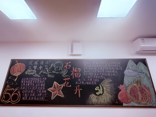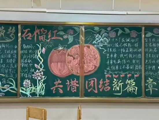此外,2025级新生班级还开展了以“同心筑梦石榴红,共谱团结新篇章”为主题的黑板报创作活动。口腔A2513班作品以红灯笼、石榴果和民族符号为主要元素,庄严热烈地呈现出“民族团结、共筑中华”的共同愿景;基础A2521、2522班合作完成的板报则通过石榴籽与民族纹样交织的创意设计,生动展现出各民族手足相亲、守望相助的美好图景。