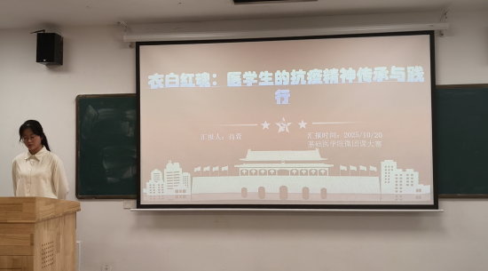 口腔A2512班肖萱以“白衣红魂:医员工的抗疫精神传承与践行”为题带来微团课。她通过回顾疫情期间青年医生挺身而出、坚守岗位的感人事迹,生动诠释了医学专业使命与红色精神相融合的奉献本色。肖萱提出,我们医员工应让抗疫精神落地生根,响应“健康中国2030”战略,以白衣为甲、红魂为核,在服务人民健康、夯实基层医疗技术的进程中贡献青春力量。
