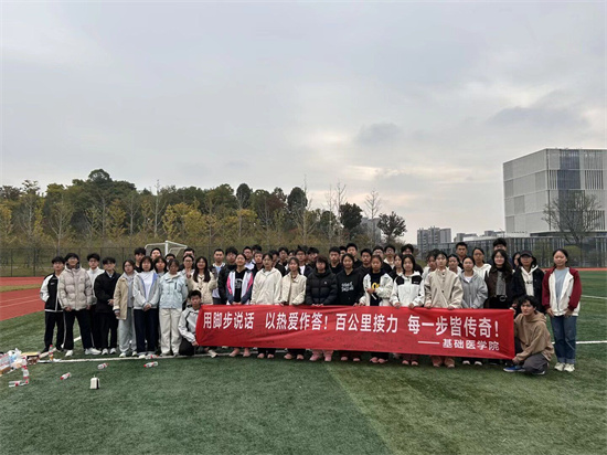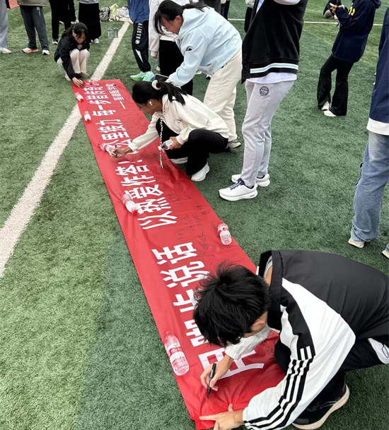 活动当天秋高气爽,正是运动佳时。开幕式上,全体参与人员精神抖擞,在田径场进行了集体合影,共同记录下这一激动人心的时刻。随后,同学们有序地在印有“百公里接力,薪火传不息”字样的主题横幅上签名留念,书写下对挑战自我的承诺与对运动精神的热爱,现场氛围热烈而庄重。