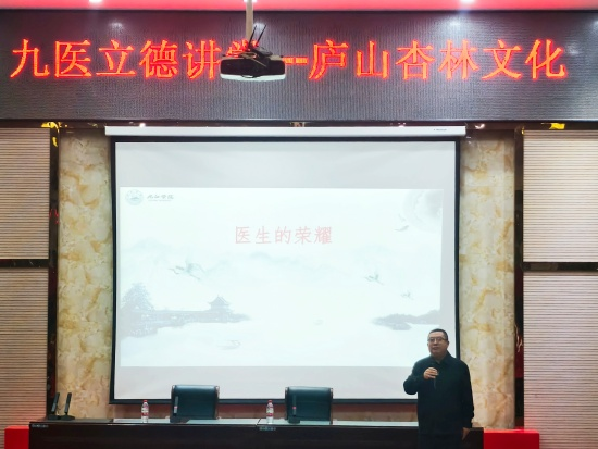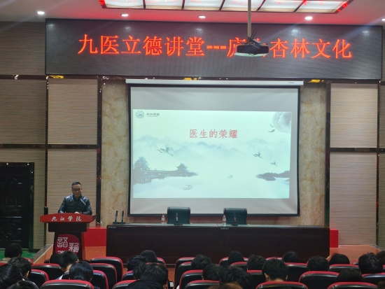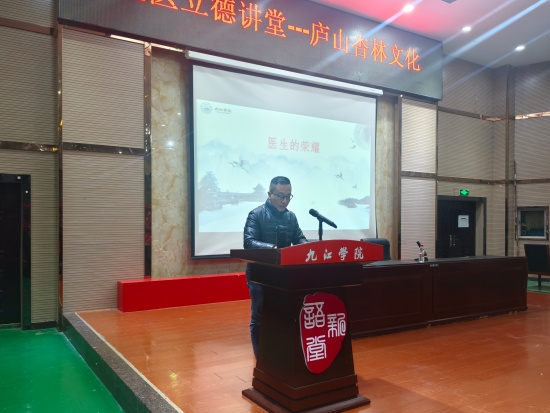 讲座中,陈晓松围绕庐山杏林文化展开深度解读。他详细讲述了建安三神医之一董奉的行医事迹,阐释庐山灵秀的山水环境与道家思想对董奉行医理念的深刻滋养,同时还系统解读了“杏”所承载的医者仁心、无私奉献、医患相睦等多重象征意义,让在场学子得以窥见传统杏林文化的深厚底蕴与精神内核。