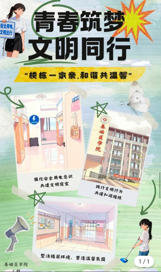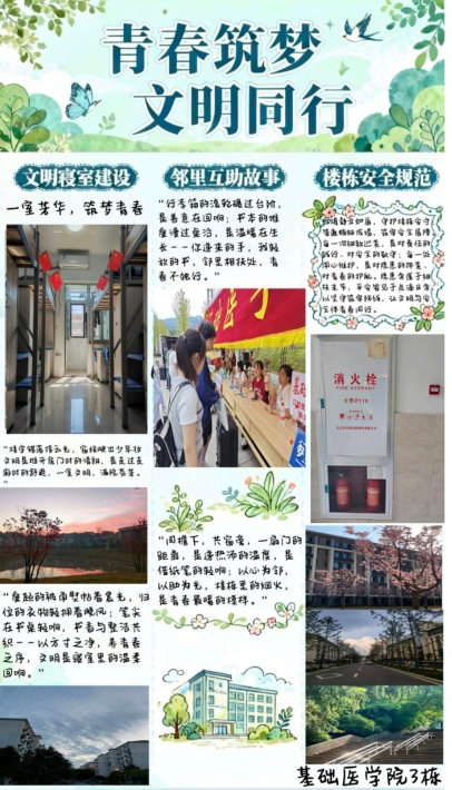 活动启动以来,同学们紧扣“青春筑梦,文明同行”主题,从青年视角与校园生活出发,创作出一系列图文并茂的板报。作品以文明寝室、邻里互助、楼栋安全为核心,生动展现了整洁的环境、友爱的互动与有序的氛围。一笔一画之间,既有对文明的倡导、对不文明现象的反思,更彰显了学子们践行文明理念的坚定决心。