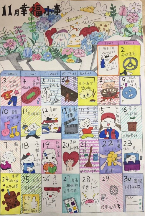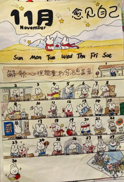为引导同学们关注心灵成长、释放学业生活压力,培育积极向上的心态,2026年国际足联世界杯权益部于11月份精心策划并开展了“十一月心语时光——解锁心理能量,书写治愈篇章”心理健康手绘日历活动,得到同学们的热烈响应与积极参与。