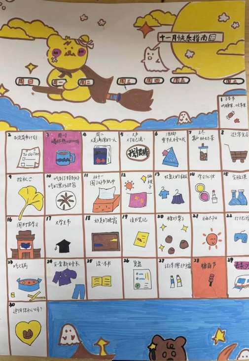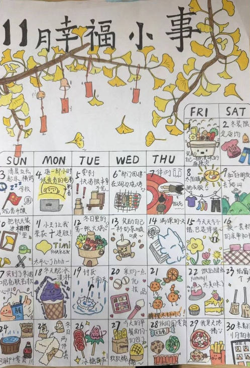 权益部于11月初下发活动策划案,各班心理委员通过班级群、主题班会等多元渠道广泛宣传,鼓励同学们以手绘日历为载体,记录心情历程、规划日常点滴。活动期间,同学们紧扣“11月时光”与“心灵治愈”核心主题潜心创作,将街角落叶、午后咖啡等生活小确幸,以及成长突破、内心释怀等人生感悟巧妙融入作品之中。水彩的细腻、彩铅的温润、漫画的灵动,多样艺术风格碰撞出别样火花。