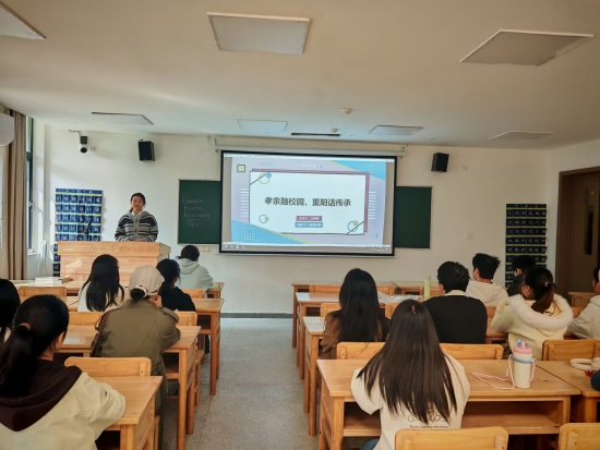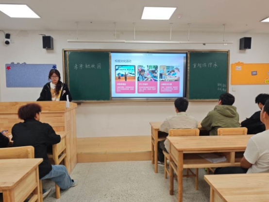在研究生楼332教室,A2351班团支书彭石云通过PPT,生动系统地介绍了重阳节的相关知识。同学们在学习中加深了对传统节日的认同,他们将以此次团课为契机,把孝亲敬老理念内化于心、外化于行,以实际行动践行孝亲敬老理念,让传统文化在校园中延续发扬。