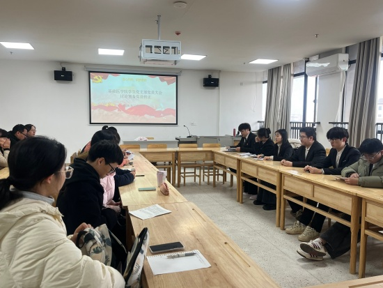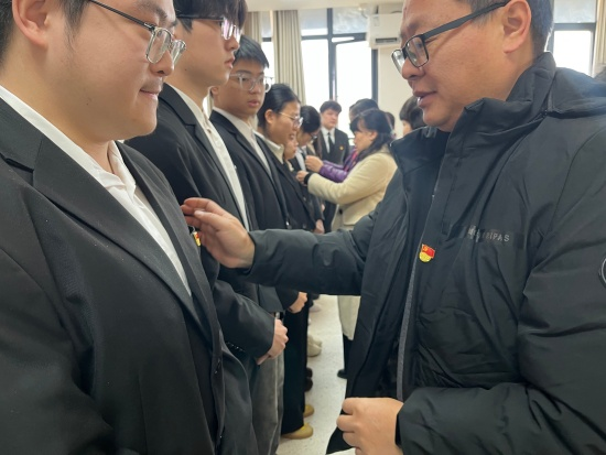 在新老党员入党宣誓环节,老党员同志庄重地为本学期新党员同志佩戴上党的徽章。一枚枚徽章在灯光下闪耀着金色的光芒,象征着责任的传承与使命的延续。之后,新老党员整齐列队,面向党旗,庄严地举起右拳,在领誓人的带领下,共同宣誓。激昂的誓言在会议室中回荡,每一个字都饱含着对党的忠诚与热爱,每一句话都彰显着为共产主义事业奋斗终身的坚定决心。