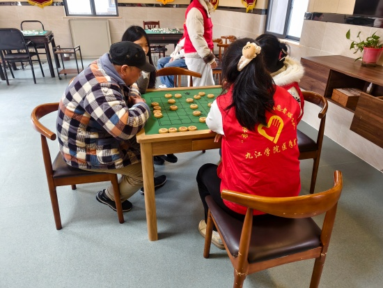 关节操结束后,志愿者兵分三路:一组推轮椅护送老人回房,整理他们的衣物;一组在庭经理椅旁倾听老人分享工作趣事与家庭往事,在专注回应间传递陪伴温情;还有一组志愿者与爱下棋的老人对弈交流,在落子声中聆听岁月故事。