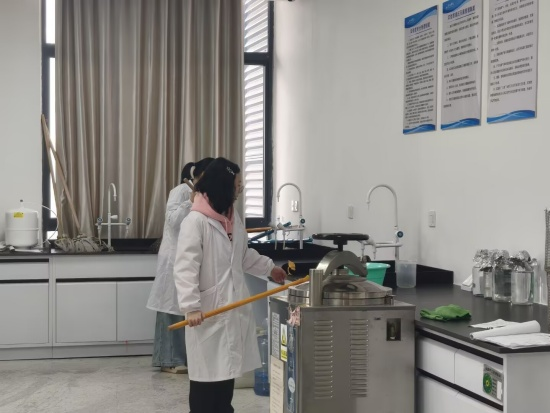 在负责老师的带领下,志愿者们首先领取了清洁工具,并认真学习了实验室安全注意事项与清洁规范。随后,大家明确分工,迅速投入工作。他们先清扫地面杂物,随后依照“由内而外、分区域清洁”的原则进行地面擦拭。遇到顽固污渍时,便蹲下身用清洁剂反复擦洗。过程中,志愿者们相互配合清理污水,现场忙碌而有序。