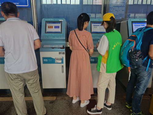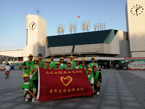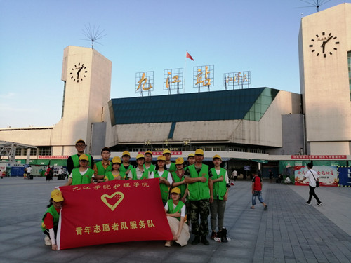 6月7日清晨,志愿者们来到九江站,工作人员对志愿者们进行培训,为志愿者们讲解注意事项、工作内容以及为志愿者们分发工作服。随后,志愿者们在工作人员的指导下被分成四队进行活动。有的在出站口、入站口为来往的乘客指引路线、提醒乘客上下电梯注意安全防止出现踩踏事故;有的在检票处耐心的协助工作人员对乘客进行检票和安检;还有的志愿者忙碌于维持售票大厅的秩序,他们不厌其烦的为乘客解说乘车时间、候车点并帮助乘客们取票。