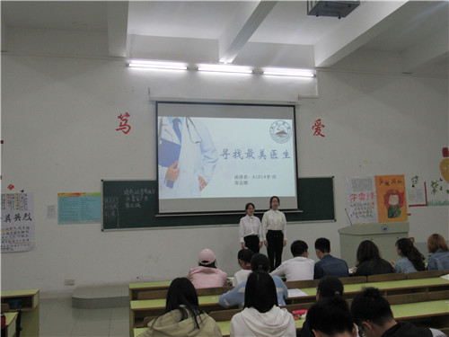 参赛人员纷纷上台用他们饱满的热情、生动的描述向同学们介绍了一个又一个无私奉献、献身医学、舍小为大的最美医生形象。被称为中国脊髓灰质炎疫苗创始人有“糖丸之父”美称的顾方舟;开创了白血病和肿瘤的诱导分化疗法的王振义;深入贫困乡村,开展健康扶贫的庄仕华小分队;“白求恩式好医生”周雅杰等。他们每个人身上无不闪耀着当代医生身上所具有的大爱精神。