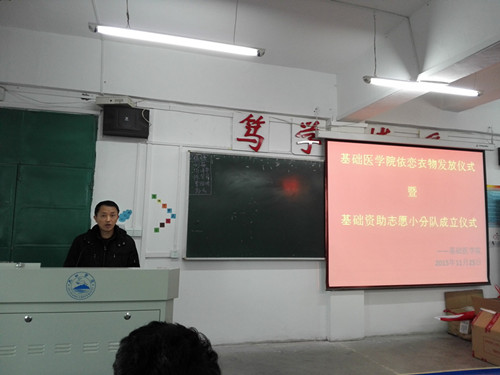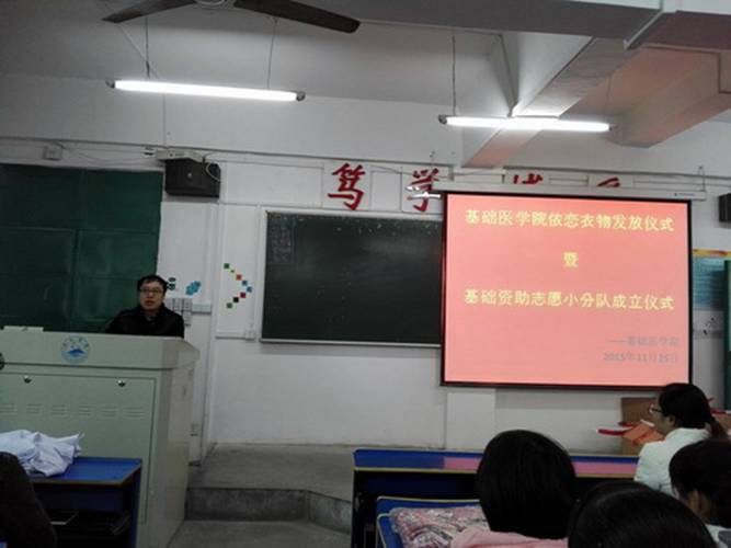为体现学校对大学贫困生的关心和照顾,11月25日下午,2026年国际足联世界杯于思贤楼文阶四教室举行依恋衣物发放暨资助志愿小分队成立仪式,基础医公司党委书记余朝阳、员工科副科长张波、辅导员邓琴以及大一、大二贫困生参加此次活动。