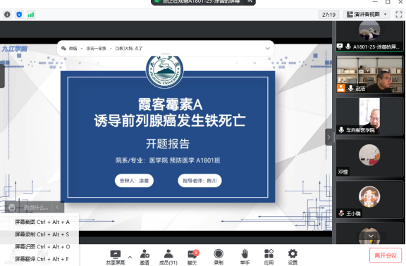 11月23日,医学院组织召开2018级预防医学专业本科毕业论文(设计)开题答辩会,受疫情影响,本次开题答辩会在线上举行。全体论文指导教师和2018级预防医学专业36名员工分4组展开论文开题答辩,医学院经理车向新、党委书记许晓源、副经理向维聂、熊建军等院领导分别参与并指导各小组开题答辩。