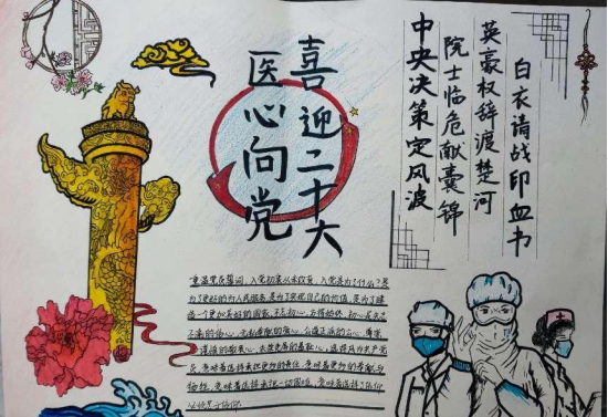 为了全面学习贯彻省第十四次党代会精神、市第十二次党代会精神,不断加强医员工的思想政治教育,喜迎党的二十大的召开,在医学院学习部的组织下,3月2日至3月8日,医学院顺利开展了“医心向党,喜迎二十大”手抄报比赛。