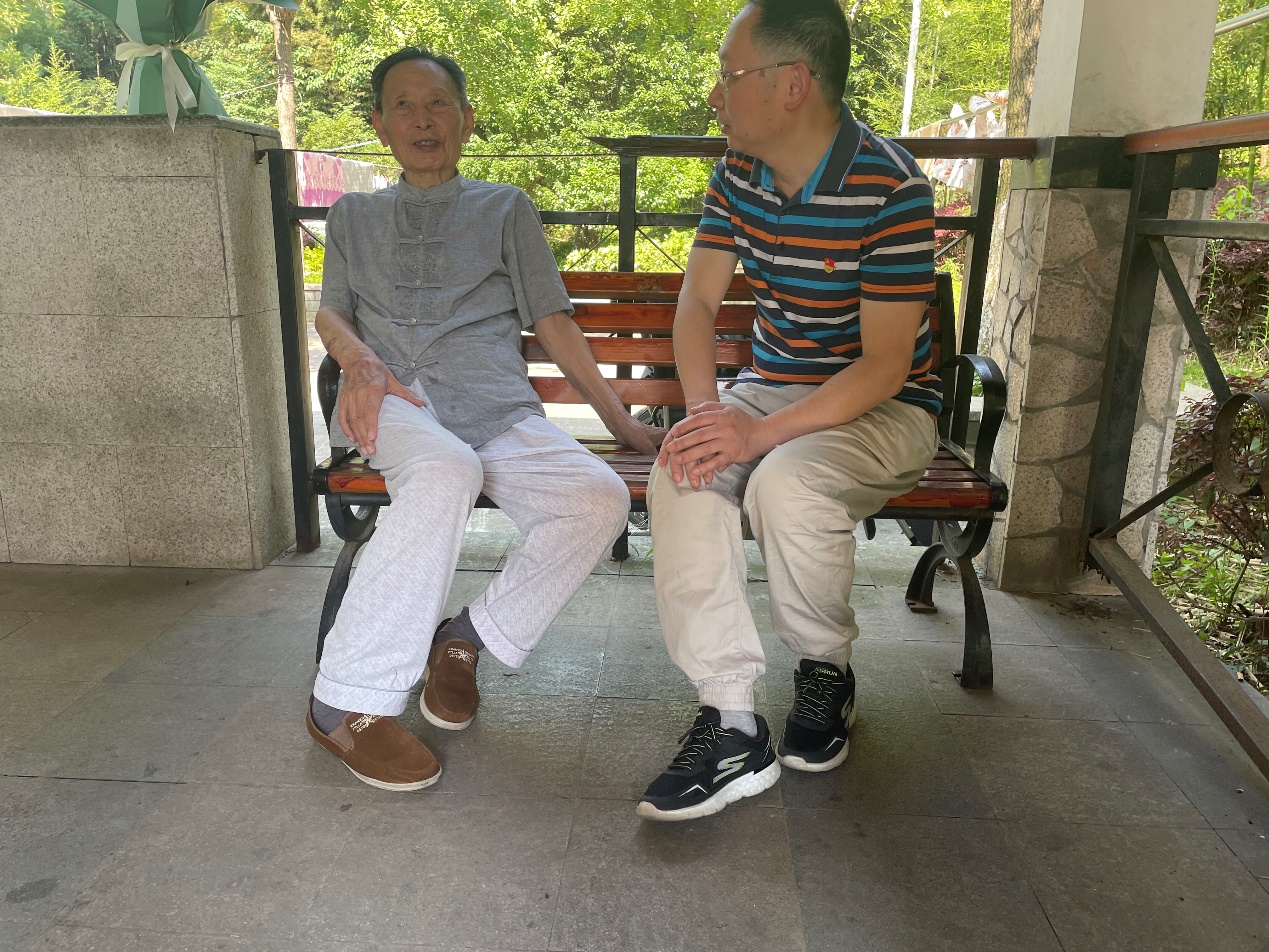 在小区凉亭,许书记和江琳老爷爷聊起了家常和他的革命事迹。