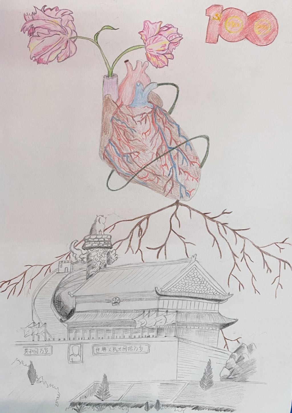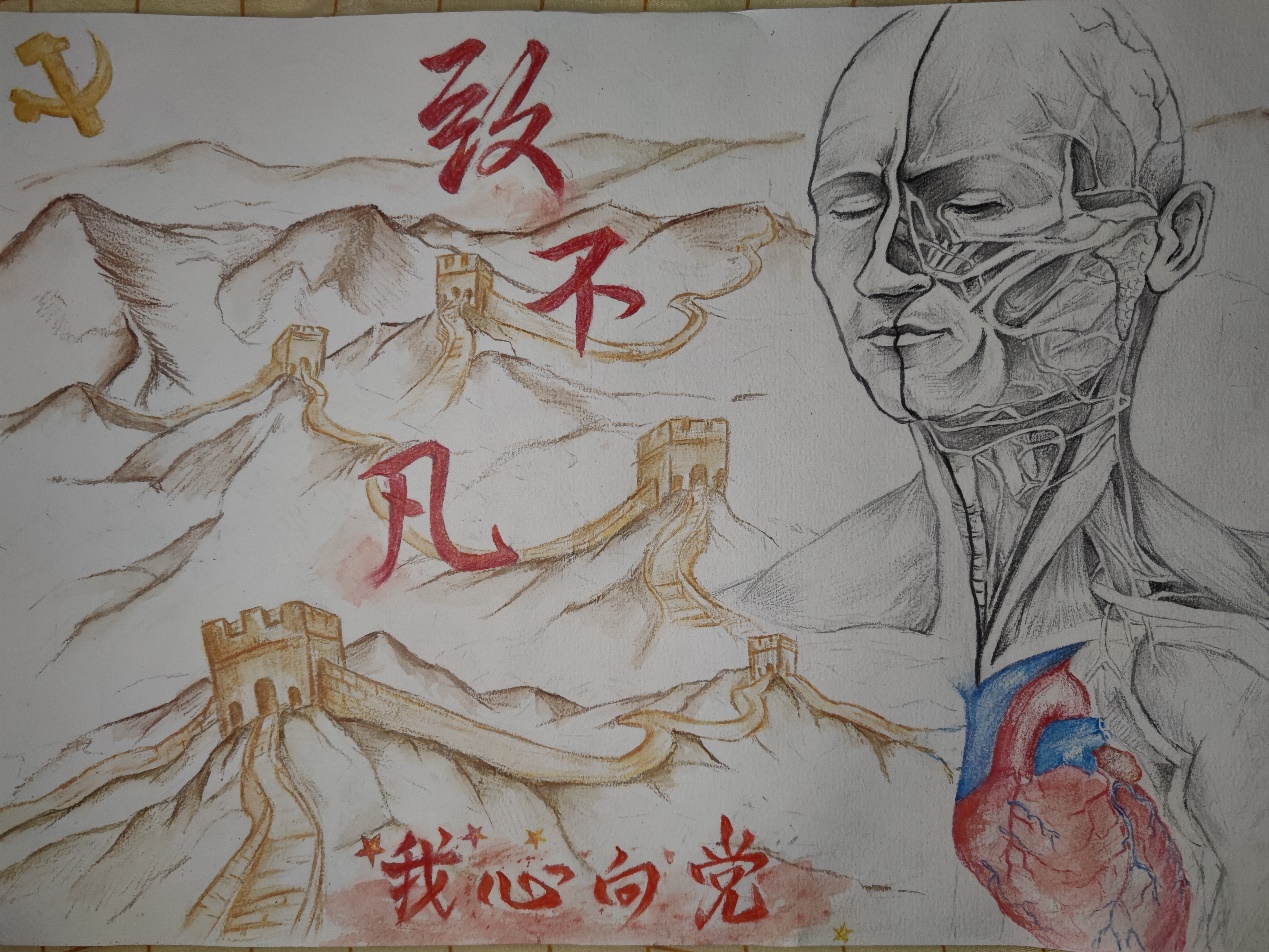 活动前期,学习部到各个班级将活动要求及细节进行宣传,积极引导并鼓励同学们参与此次活动。在绘画作品中同学们充分发挥自身想象,不拘泥于特定框架,一幅幅解剖图与红色元素相得益彰。每一位参赛选手将浓浓的爱国情结合到绘画作品中。其中《以初心,致不凡》将人体与长城相融合,结构中扑通扑通的心脏在诉说着“我心向党”的真挚情感。比赛作品由解剖室老师们进行评选,各位老师根据作品的科学性、准确性以及与红色元素的融合性,分别评选出了一、二、三等奖。A2041郝佳诗《以初心,致不凡》和A2012吴菁《虚实》荣获一等奖,A2015谢金林《苦尽“肝”来》和A2031章威婷《胸椎T6上面观&庆祝党成立100周年》荣获二等奖,A1914王云超《敬畏生命》、A2013龙子玉《股骨》和A1916刘嘉欣《以党为根,心上开花》荣获三等奖。