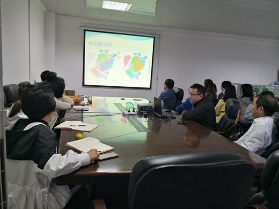 随后龙锴博士作题为《MSC成骨成脂分化衰老相关分子表达变化》的学术报告,对前期单细胞测序相关工作进行了总结,指明衰老特征基因和相关细胞表型,挖掘了在MSC成骨成脂分化过程中发挥重要作用的部分基因及其表达变化情况,经过数据分析和大家的热烈探讨,龙锴博士明确了自己下一步的研究计划。