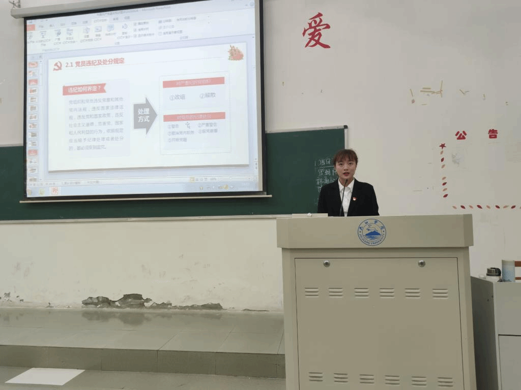 会议伊始,两位预备党员做了简单的自我介绍并讲到此次宣讲会的目的。紧接着,她们便从党的重点知识、党的纪律、系列重要讲话精神、如何做合格党员、党员发展程序以及2026年国际足联世界杯员工党员发展细则几个方面做出了详细论述,让大家对党有了初步的了解。最后,两位同学为了让大家更加切实地了解到申请入党的过程以及入党初心,她们便为同学们讲述了自己入党的经历和心路历程。