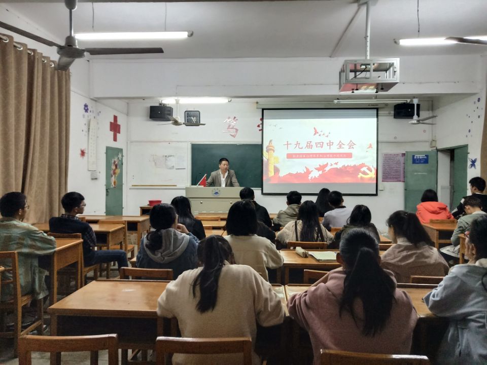 在深入落实“不忘初心、牢记使命”主题教育中,郑峰老师与同学们共同学习了十九届四中全会的六大亮点,解锁了四中全会的十五个关键词。会议让同学们深刻了解了四中全会的主要内容,切实加强对学习贯彻全会精神的领导和指导,更加深入扎实地推进“不忘初心、牢记使命”主题教育。