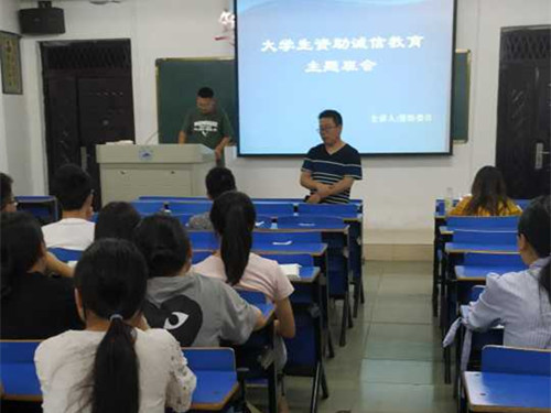 同学们认真、耐心听取资助委员的演讲,学习相关的国家资助政策,了解生源地助学贷款违约后果等。