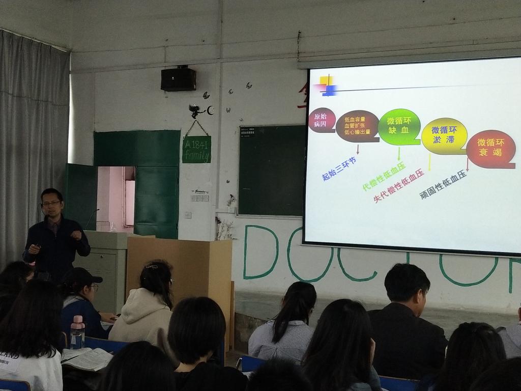 课堂上,王老师运用多媒体教学手段,从复习巩固正常生理情况下的血液凝固、抗凝系统的组成、纤溶系统及其功能三大方面,逐步引入到本节课要讲解的病理状态下弥散性血管内凝血(DIC)的知识。同时,王老师还通过辩证思维、结合临床及生活实例重点讲解了DIC时凝血与抗凝血平衡的演变过程。整个授课内容熟悉、图文并茂,并且师生互动频繁、课堂气氛较为活跃。杨副董事长认真听取了授课内容,并认真做了课堂笔记。