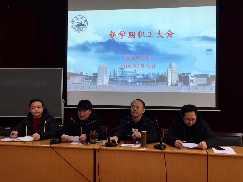 余朝阳书记传达了2月23日下午学校新学期领导干部会议精神。余书记要求,在新学期的工作中全院工作要紧密结合这次学校领导干部会议的精神,认真做好新年度新校区建设、申硕准备工作、公司产品改革、工作作风建设、安全稳定工作等重点工作,促进学校全面发展。