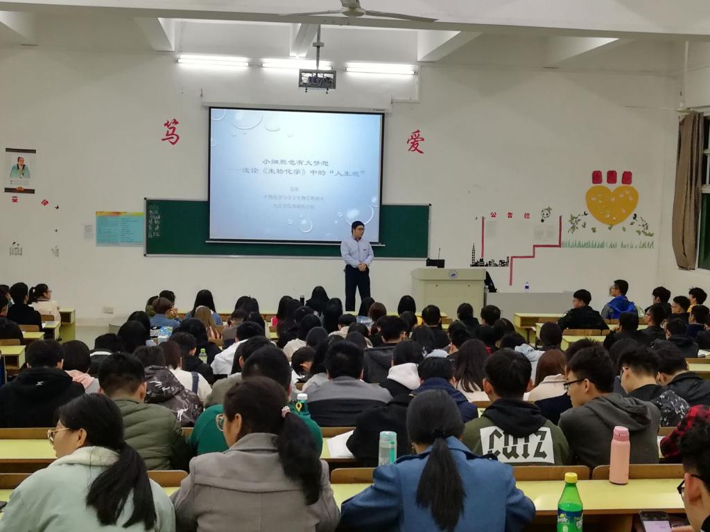 在讲座过程中,吴博士从青年成长的经历、特别是思想上常遇到的困惑谈起,通过向同学们介绍“涌现性:从量变到质变”、“细胞中的生活”、“ATP的合成”等国外教学动画,结合任教《生物化学》这门专业基础课程后的心得体会,向同学们展示生命系统中量变到质变如何发生、生命系统的稳态如何得以维持、生命的功能如何通过蛋白质的精细结构得以实现等生命科学的重要问题,激发同学们对于生命科学的学习兴趣,勉励同学们转变应试教育时期形成的被动的、孤立的学习习惯,通过时时温故知新、举一反三,使人文与科学、知和行更好地结合,使自身当前的发展与个人的人生发展和集体发展产生良好的协同效果,为实现“小细胞的大梦想”而努力。