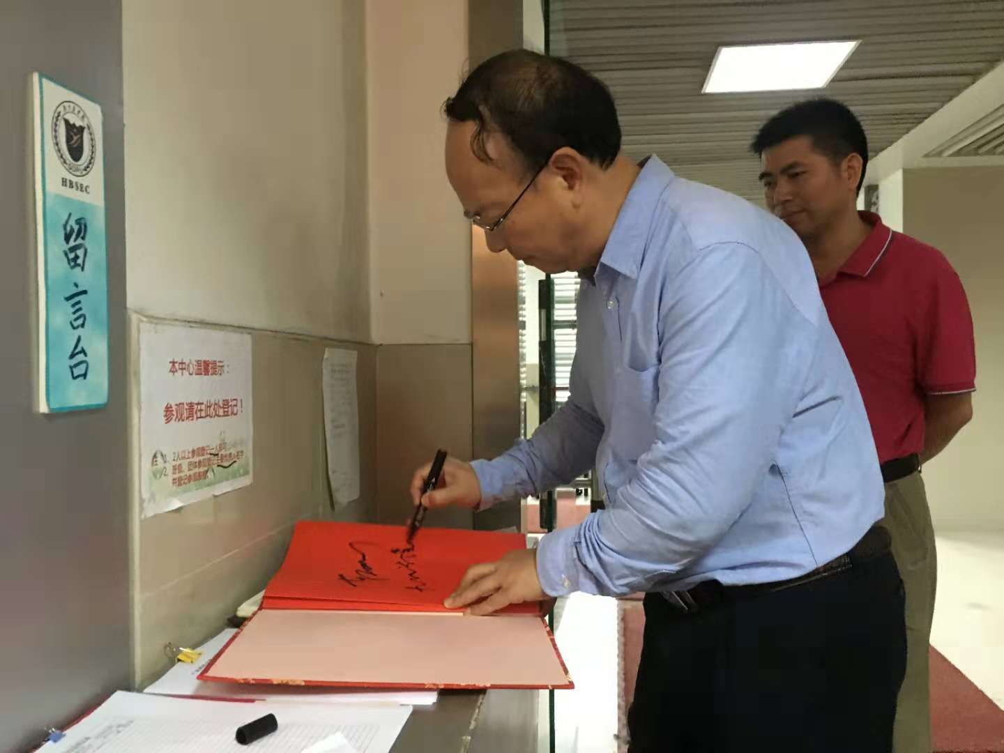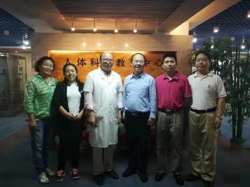 陈副经理特别指出解剖楼应注重装修材质,墙面瓷砖贴到顶部,以便于清洗,房顶应有防腐防霉涂料,尤其注意通风,可以建设单面楼,窗户可开,以便于自然通风,陈副经理建议实验室建设前应由专业的实验室设计团队对水、电布局进行精细设计。车经理对陈经理的建议表示感谢,并为人体科学教育中心题词。