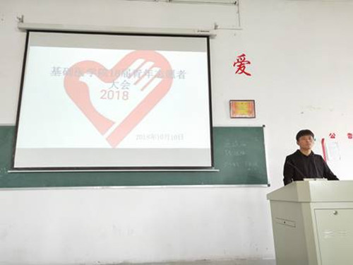 大会伊始,队长张开向全体志愿者成员介绍青年志愿者服务队负责人以及2018届骨干,并向新生志愿者叙述往期志愿者所参加的各种具有代表性的志愿活动,主要有禁毒活动、血车服务和慰问阳光康复中心活动等,表示希望通过开展多项志愿活动,使新生志愿者们能在行动上关爱社会,及时了解群众急需,在自己的能力范围内有所作为;在思想上倡导团结友爱、助人为乐、见义勇为、无私奉献的新风和正气,弘扬爱国主义、集体主义和社会主义精神。同时也使新生志愿者在服务社会、帮助他人的过程中提升社会公德意识和增强责任、义务观念,提高自己的思想道德和科学文化素质。