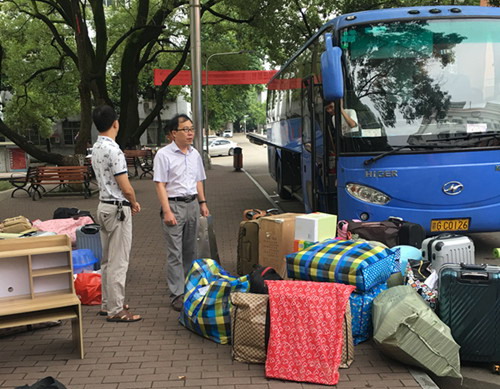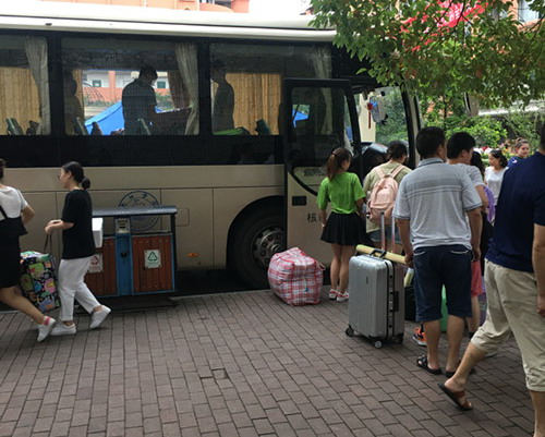 早上6点半,各班即把行李放到指定地点,按照班级顺序有条不紊地把行李搬上校车。在此过程中,同学们都发扬互帮互助、团结友爱的精神,同时,男同学主动承担沉重行李的搬迁任务。最后,到庐峰校区后,新任班主任于门口迎接各位同学们。
