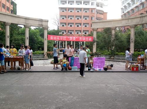 现场除了设立各班摊位外,还设立了咨询台、出售处和爱心捐赠处。活动一开始,就获得了同学们的积极响应,大家围聚在各个摊位前,整个场面人潮涌动。摊位上各类二手商品应有尽有, 新奇独特。女生们把自己多余的包包、娃娃、护肤品等摆了出来;男生们把自己不用的哑铃、篮球、吉他等拿到跳蚤市场转让;另外,还有各种书籍的转让,大家把自己看过的闲置的书拿出来转让, 分享知识、分享快乐;还有的同学现场制作水果杯进行出售等。活动现场热闹非凡。